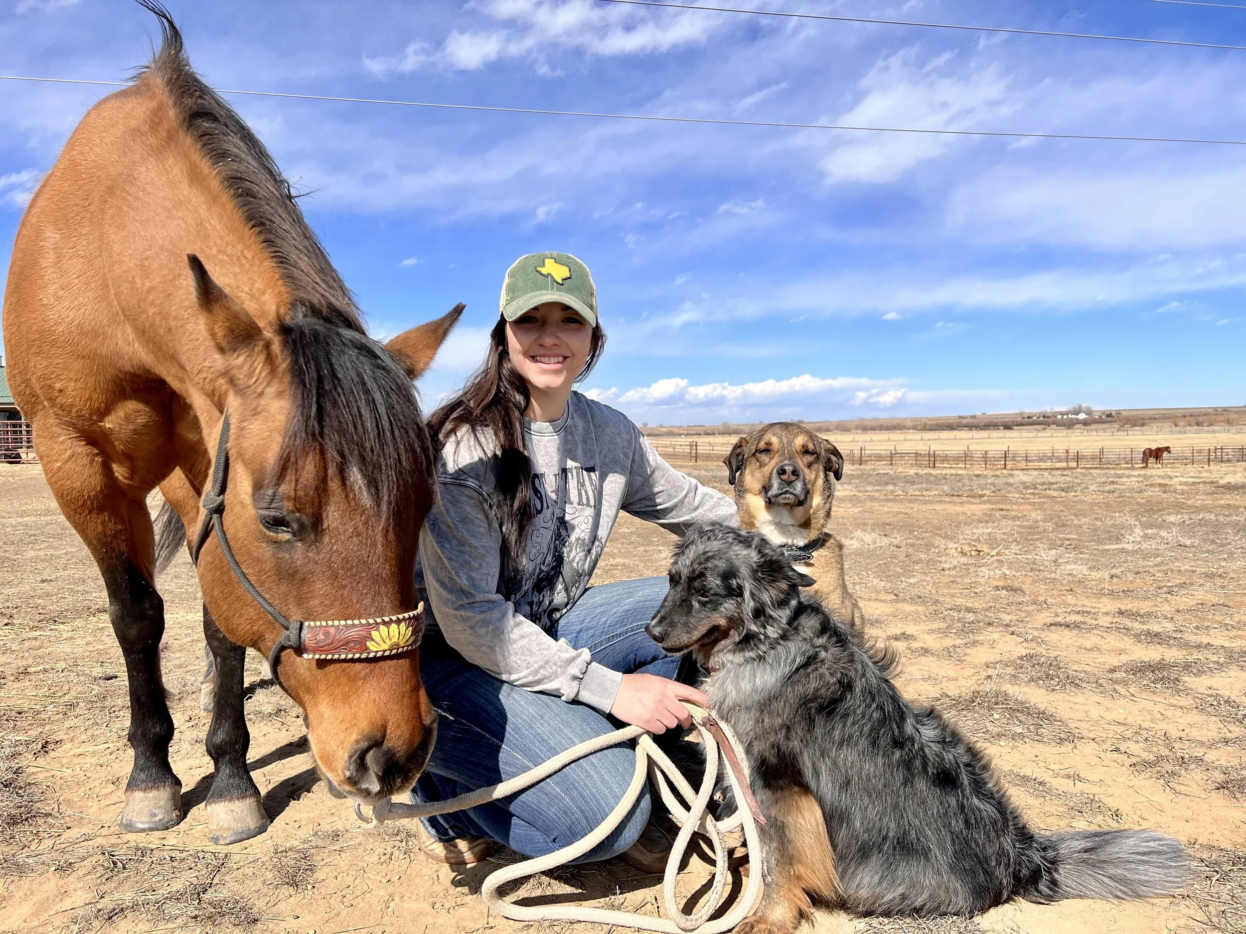 Morgan with her horse Sunny and dogs, Cosmo and Luna.